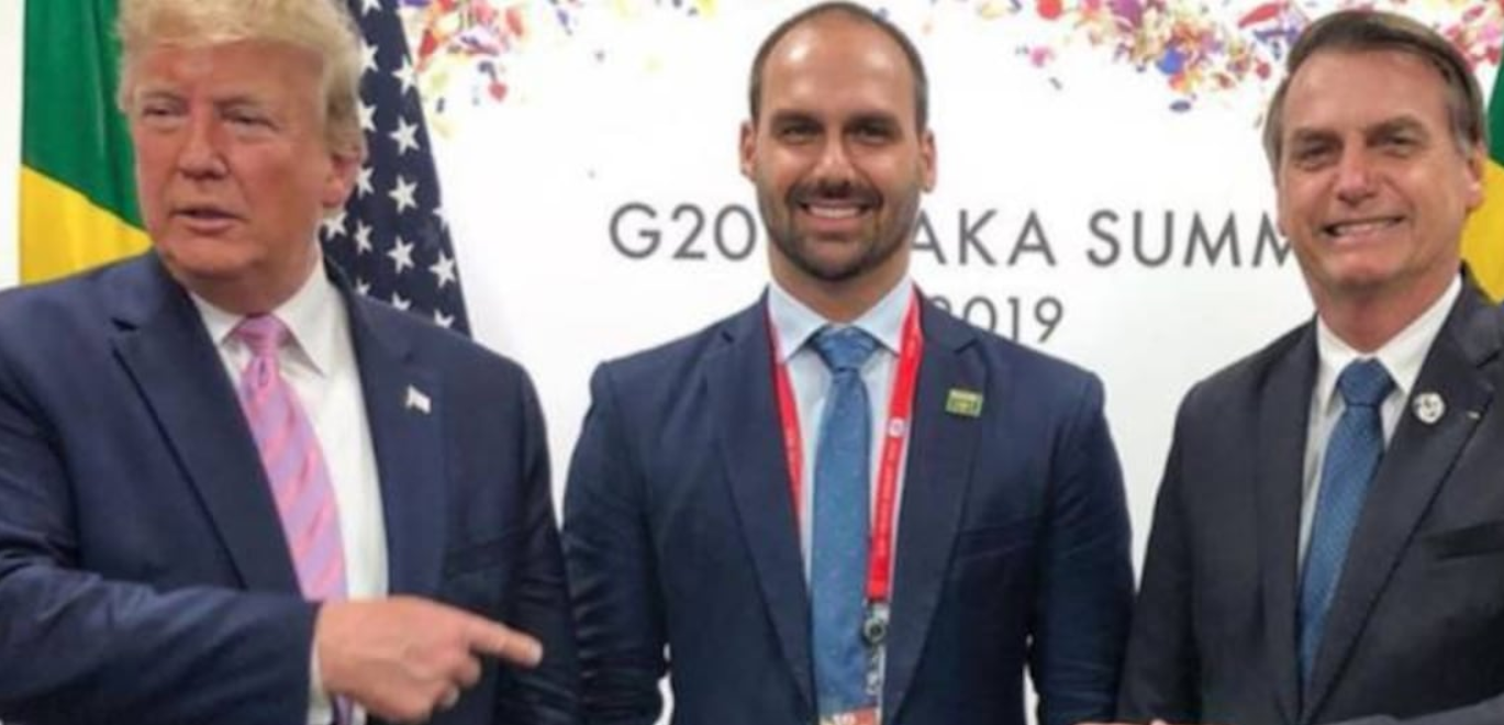 Eduardo ao lado do pai e de Trump, no encontro do G20, em foto publicada por ele em seu Instagram. Reprodução/Instagram
